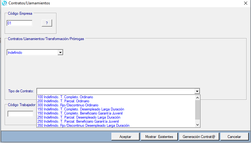 Indique el código de la empresa y le aparecerán los Contratos generados.