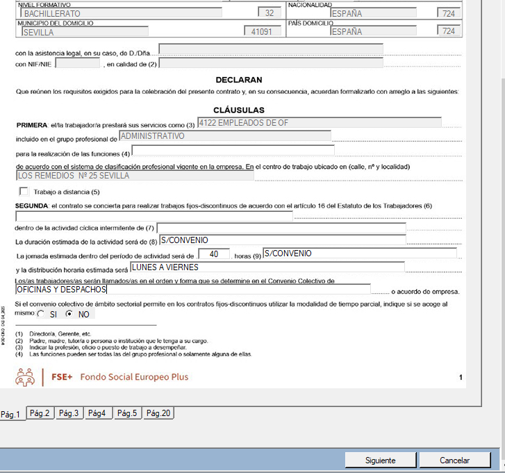 Aparecerá el modelo de Contrato seleccionado rellenable con sus páginas correspondientes, donde poder cumplimentar los datos específicos de cada Contrato.