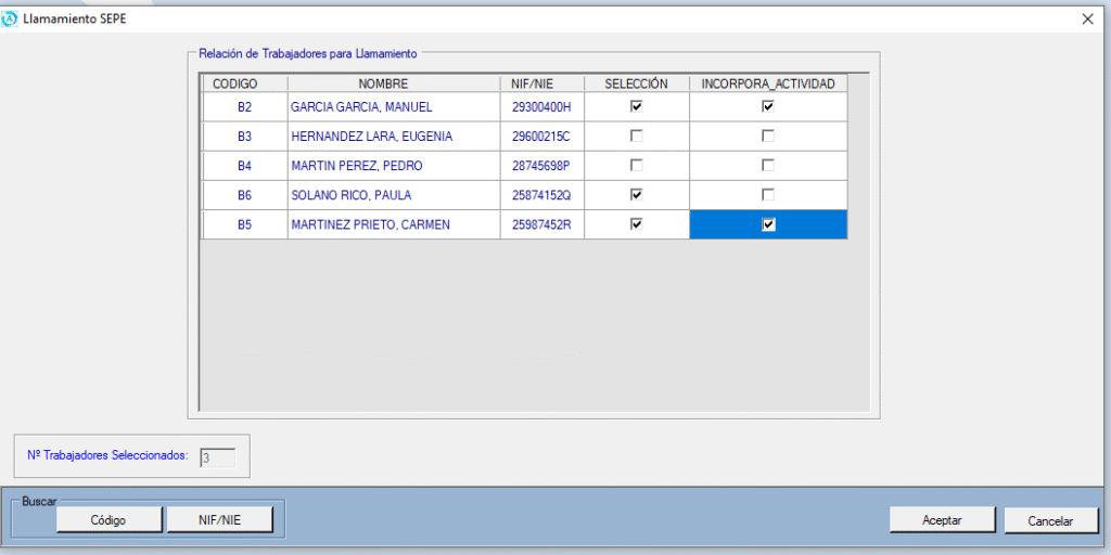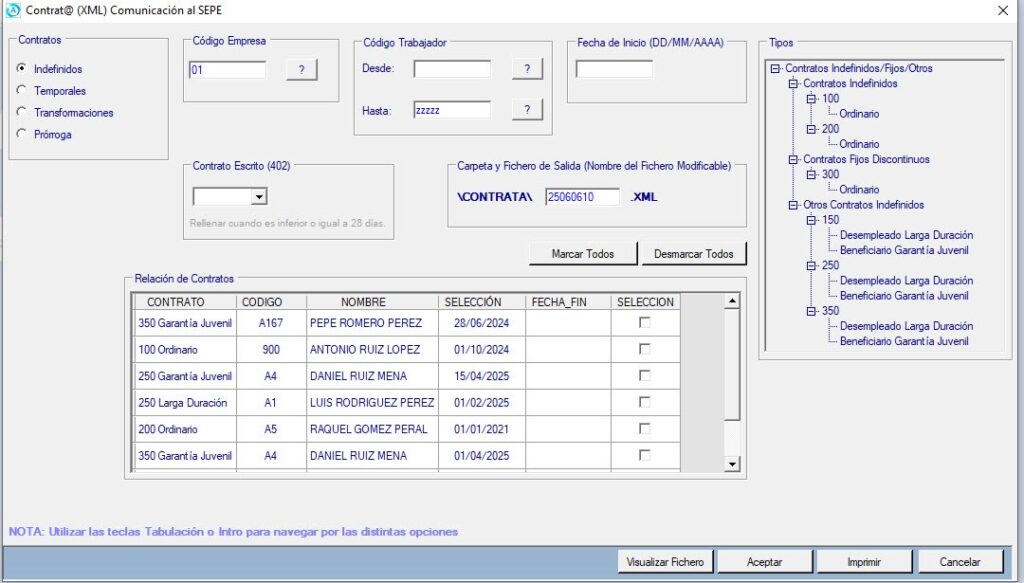 Al seleccionar un Llamamiento y pulsar Aceptar se genera el fichero XML con todos los trabajadores que tengan el mismo código de Llamamiento.