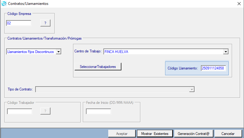 Deberá indicar el código de la empresa. Si además indica el centro de trabajo podrá visualizar por pantalla solo los Llamamientos correspondientes a dicho centro.