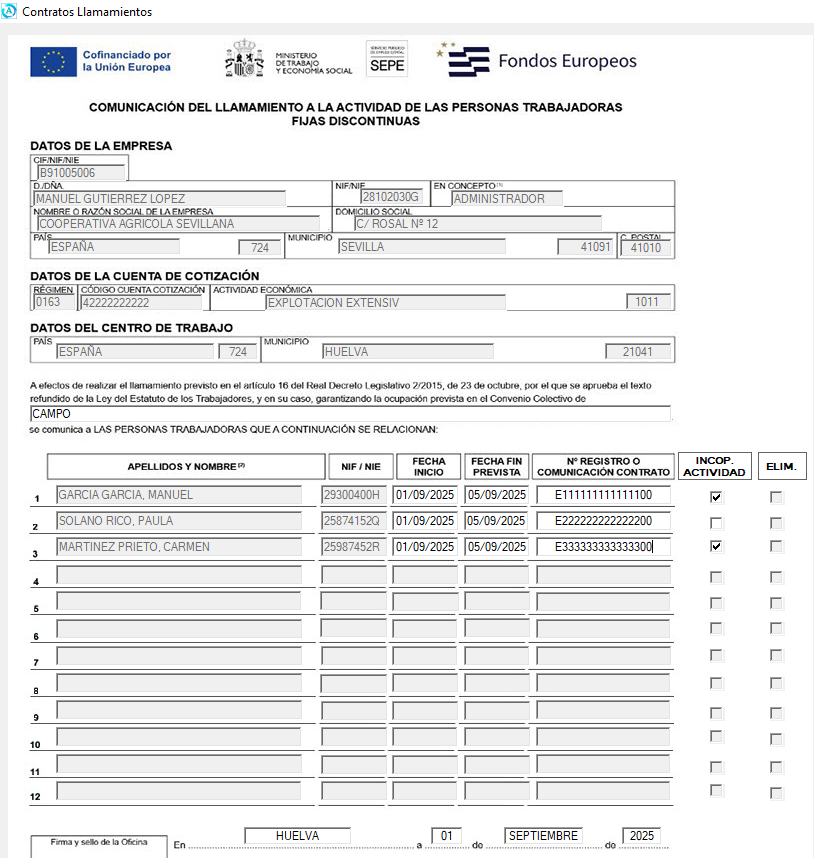 Aparecerá el modelo de Llamamiento rellenable para indicar la Fecha de inicio y Fecha de fin prevista, así como el Número de registro o Comunicación de Contrato.