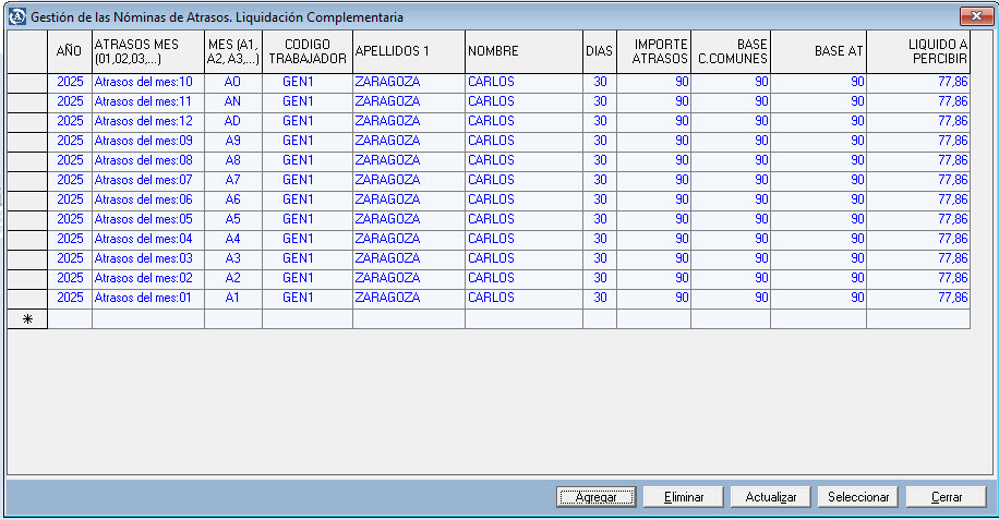 - Indicar: Año, Atrasos mes, Mes (A1, A2, A3…), CĂ³digo del trabajador, apellidos y nombre, DĂas de atrasos, Importe de los atrasos, Base de CC y Base de AT.