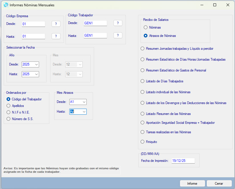 Para generar el informe e imprimir las nĂ³minas de atrasos hay que ir a la opciĂ³n de Informes< NĂ³minas< Mensuales< Atrasos de NĂ³minas.