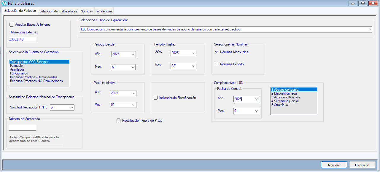 Para calcular el Fichero de Bases, debemos ir a la opciĂ³n de Sistema Siltra <Fichero de Bases y seleccionamos el modelo L03 (LiquidaciĂ³n de atrasos) seleccionando los meses de atrasos que corresponden a la liquidaciĂ³n.