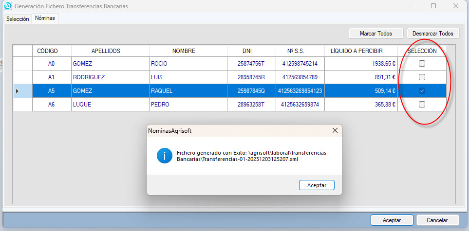 El fichero generado se guardará en la carpeta C:\agrisoft\laboral\Transferencias Bancarias\