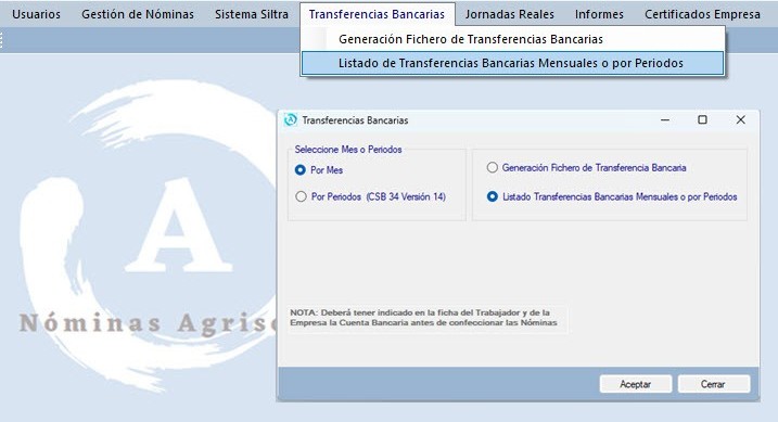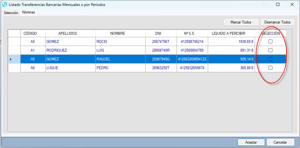 Nuevas opciones para generar el Fichero de Transferencias Bancarias por Mes o por Periodos pudiendo seleccionar individualmente a los trabajadores que queramos realizar la transferencia en el mes.
