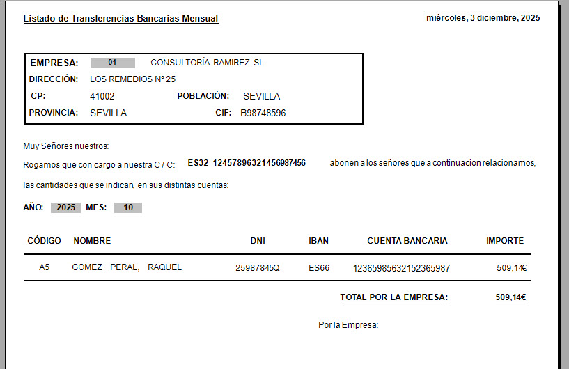 También puede obtener el Listado de Transferencias Bancarias Mensuales o por Periodos seleccionándolo por trabajador.