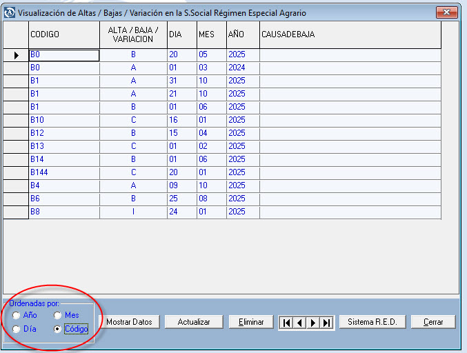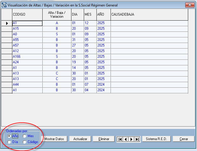 Una vez creada el alta, baja o variación de un trabajador en Afiliación, si queremos revisarlos accedemos al apartado Visualización, pudiéndolos ordenar por Año, Mes, Día o Código de trabajador según lo deseado.