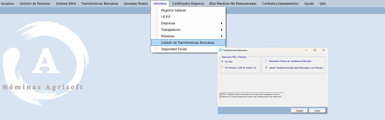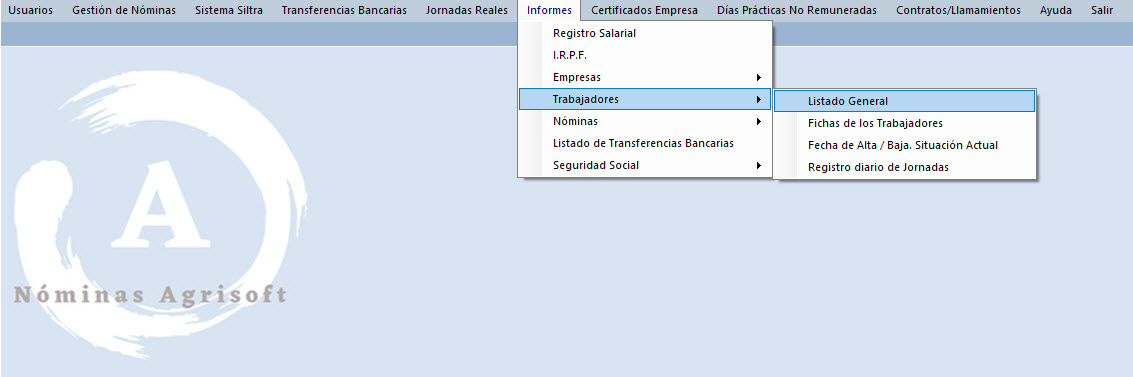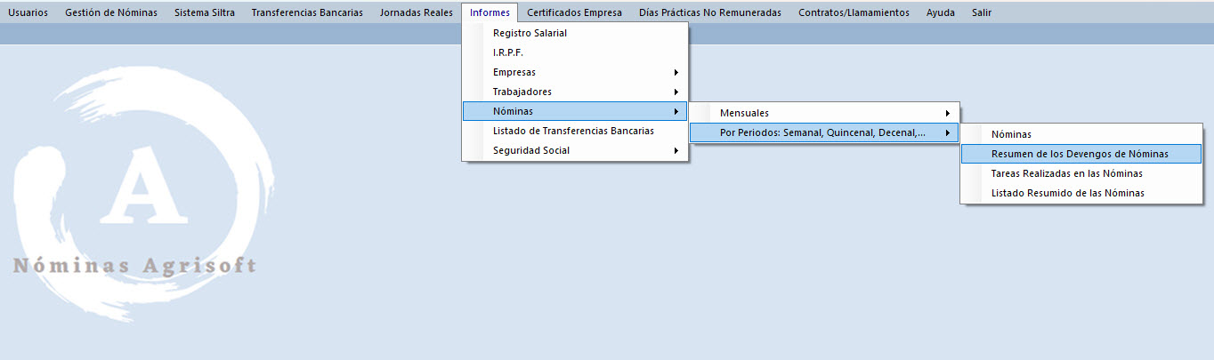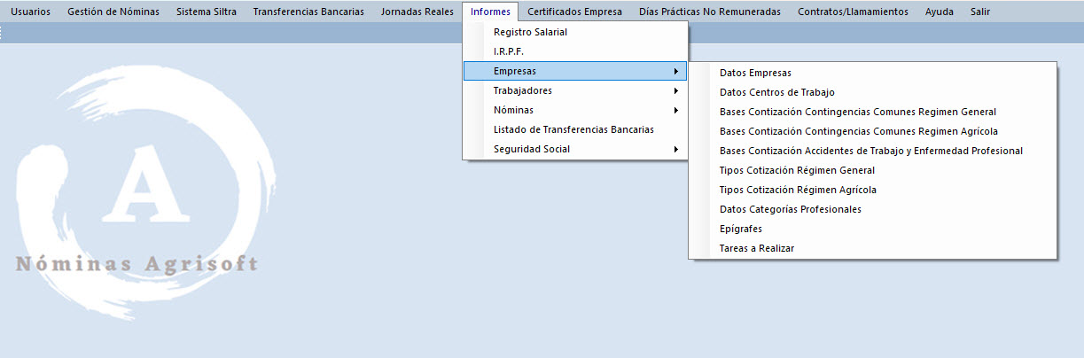 Estos informes los puede obtener desde la pantalla NominasAgrisoft en la opción Informes: