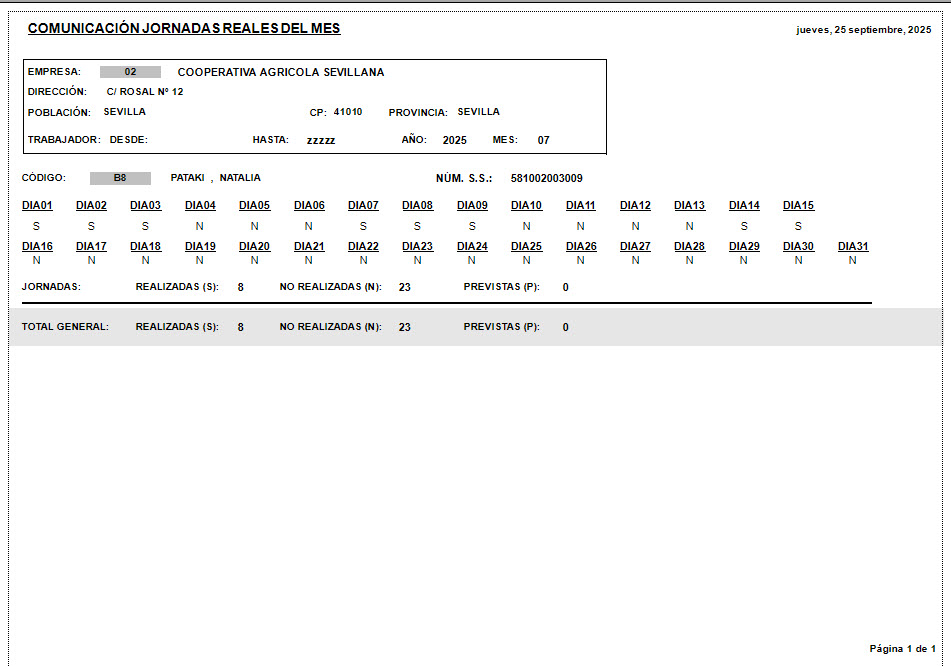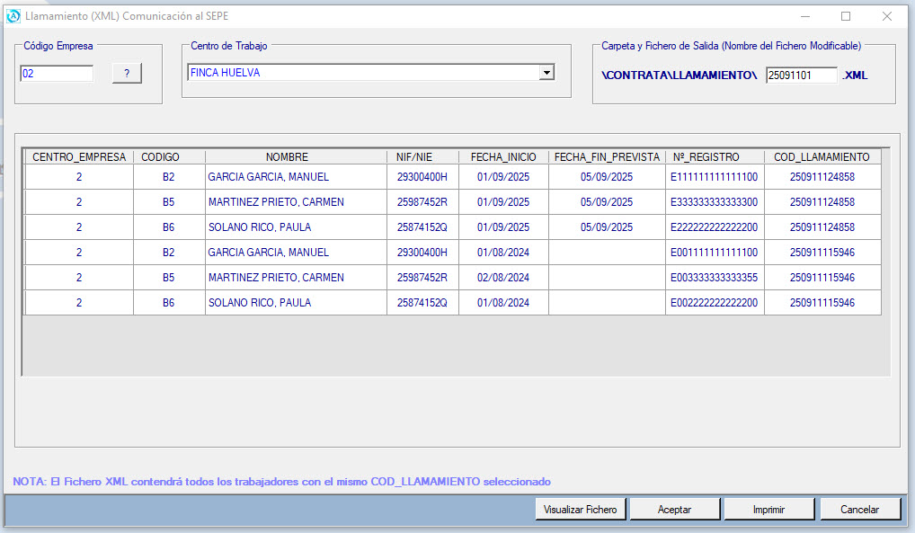 Al seleccionar un Llamamiento y pulsar Aceptar se genera el fichero XML con todos los trabajadores que tengan el mismo código de Llamamiento.