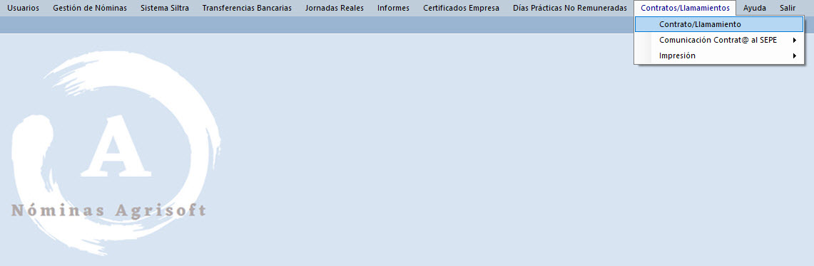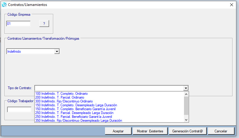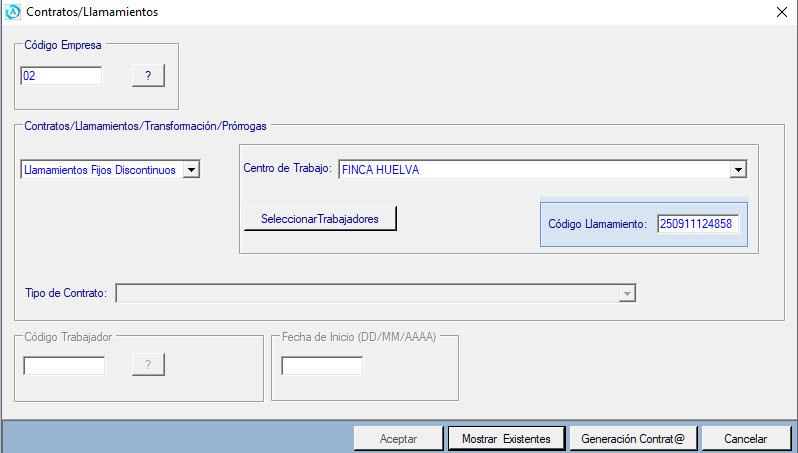 Deberá acceder al menú Contratos/Llamamientos indicando el código de empresa y trabajador correspondiente, así como el Contrato que desee realizar.