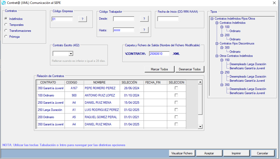 Para generar el fichero XML de Contratos deberá indicar el código de la empresa y le aparecerán los Contratos generados.