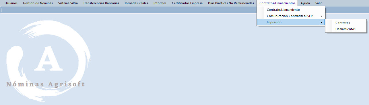 Podrá imprimir los Contratos y Llamamientos realizados desde el menú Contratos/Llamamientos pulsando en Impresión.