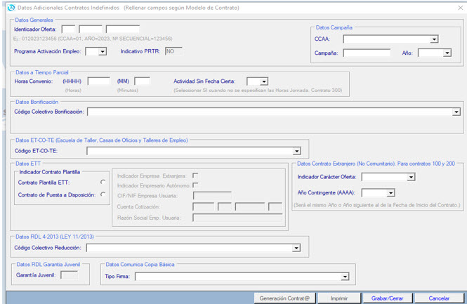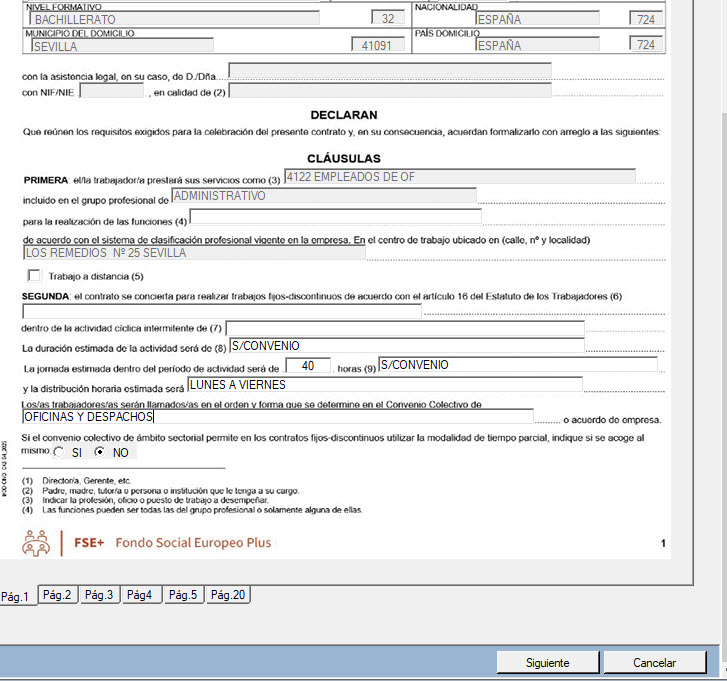 Al pulsar Aceptar aparecerá el modelo de Contrato seleccionado rellenable con sus páginas correspondientes, donde poder cumplimentar los datos específicos de cada Contrato.