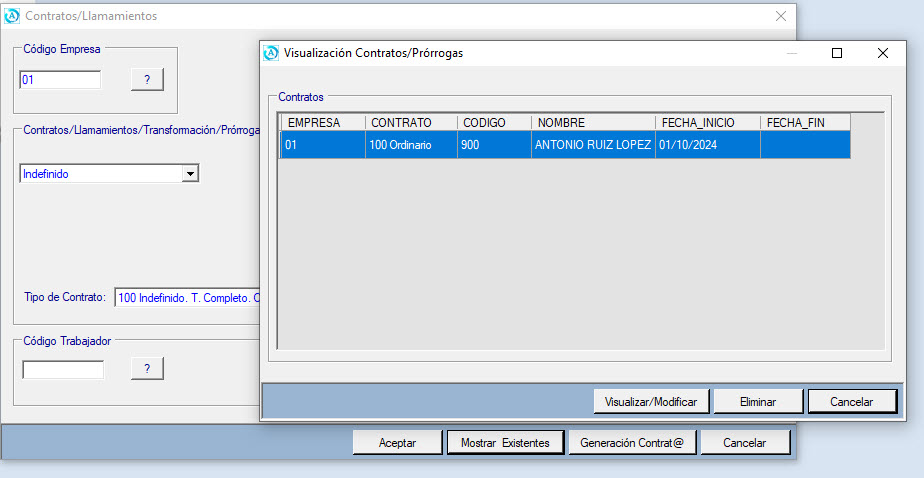 Podrá visualizar los contratos realizados pulsando el botón Mostrar Existentes.