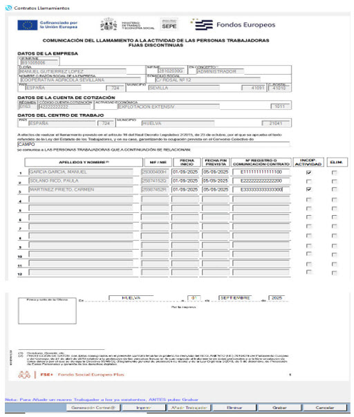 Deberá seleccionar los trabajadores a los que desee realizar el Llamamiento, indicando si se incorporan a la actividad.